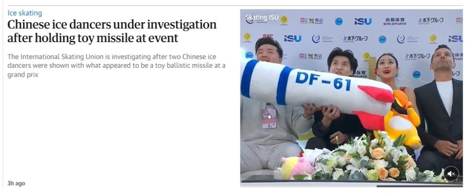 中国组合任俊霏/邢珈宁在完成冰舞表演之后,捡起中国观众投掷的东风毛绒玩具,邢珈宁和教练郑汛拿着它在等分区玩耍。结果,美国网友竟然因此破防,发文进行指责。
